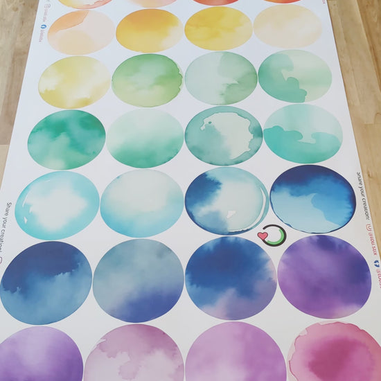 40 individual watercolor painted circle dots in a rainbow color gradient. 5.5" each
